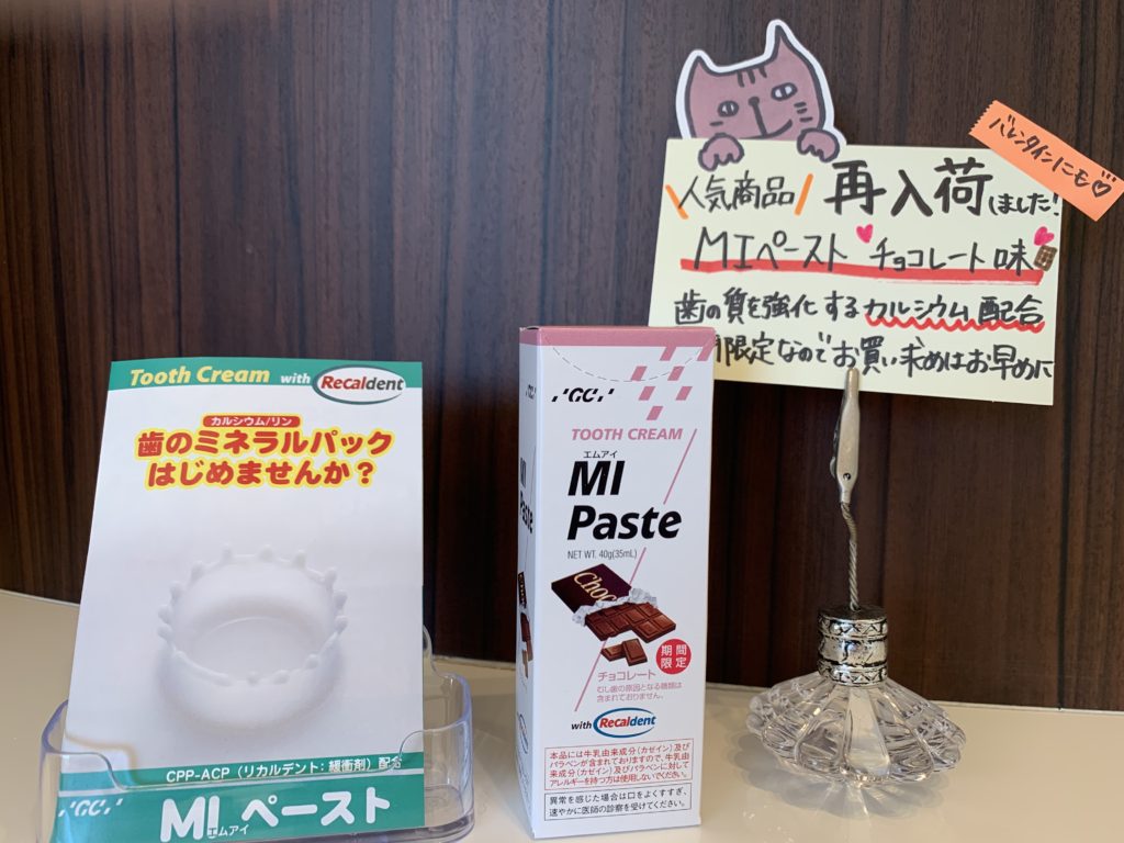 もうすぐバレンタインということもあって…????子供達にも人気のチョコレート味が再入荷しました〜???? フッ素とはまた違って…????の質を強化します。知らないうちに歯から溶けだしているミネラルやカルシウムをMIペーストを塗る事によって強化してみましょぉ〜♡