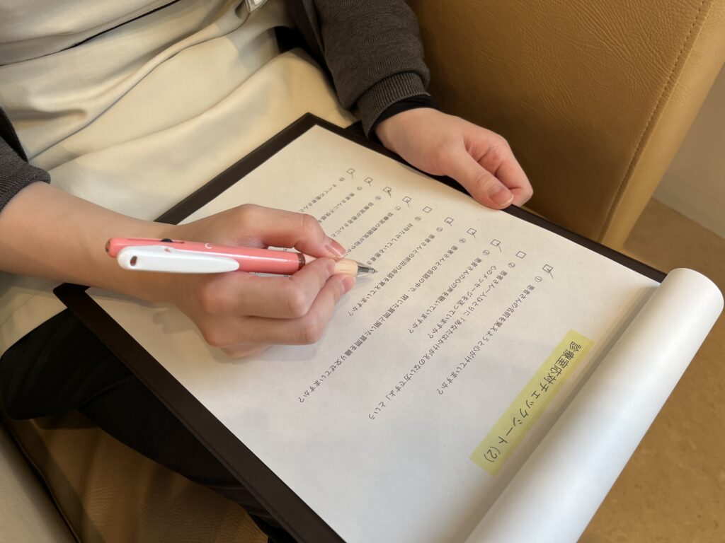 今回は、それぞれが患者さんに対してちゃんと応対ができているか、備品が古くなってきてはいないかのチェックをしました👀