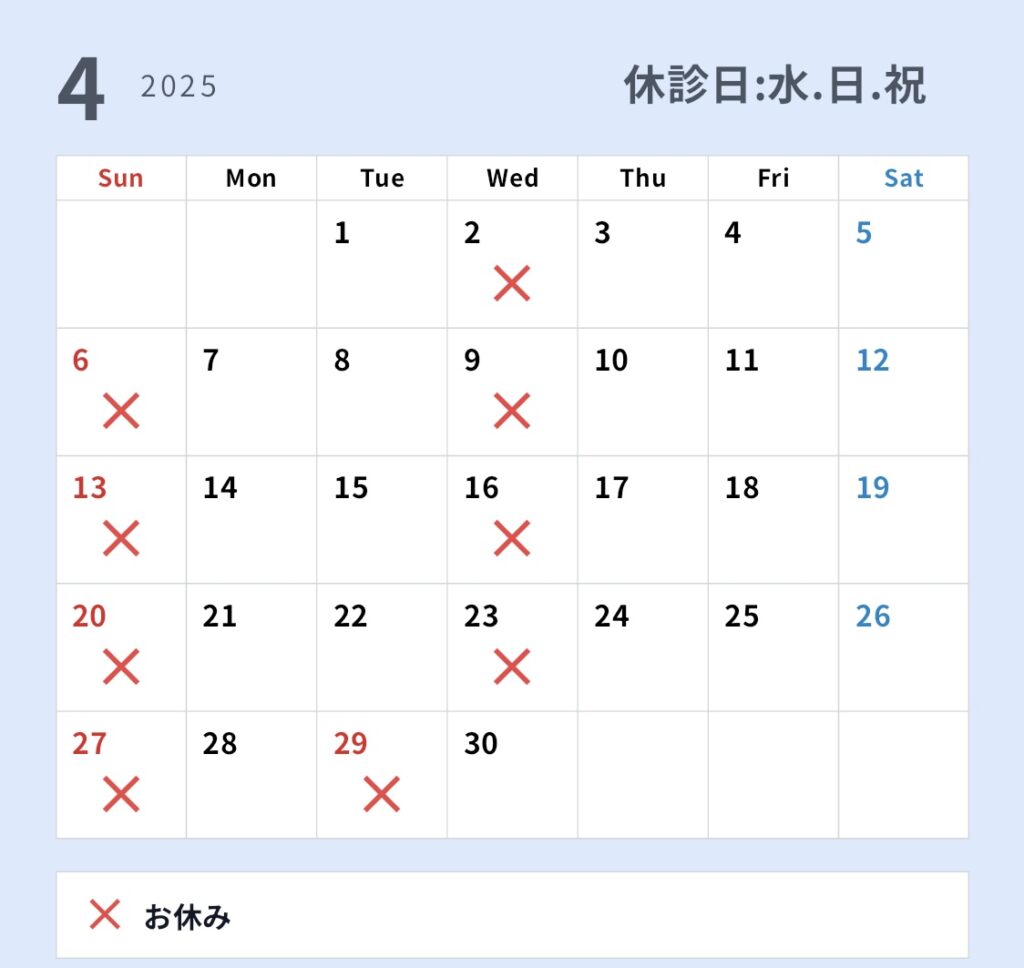 | 診療時間 | 月 | 火 | 水 | 木 | 金 | 土 | 日 | 祝 |