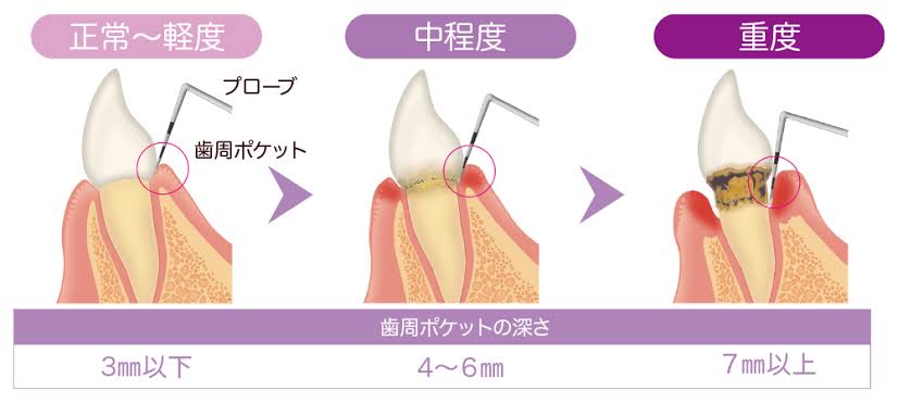 3ミリ以内が健康な歯茎、4ミリ以上は歯周病が進んでいるサインとなります。