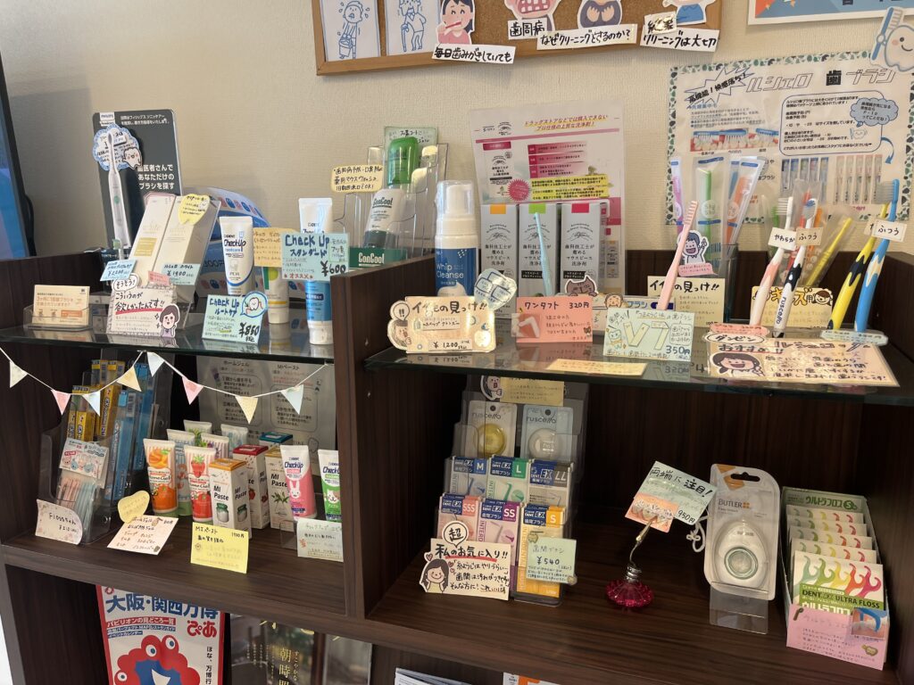 歯ブラシやフロス、歯磨剤、洗浄剤など色々置いていますので、来院の際はぜひ見てみてください😊
