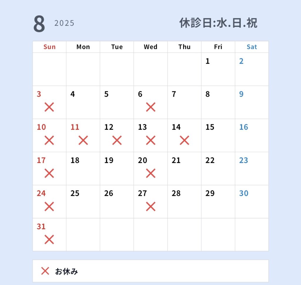 | 診療時間 | 月 | 火 | 水 | 木 | 金 | 土 | 日 | 祝 |