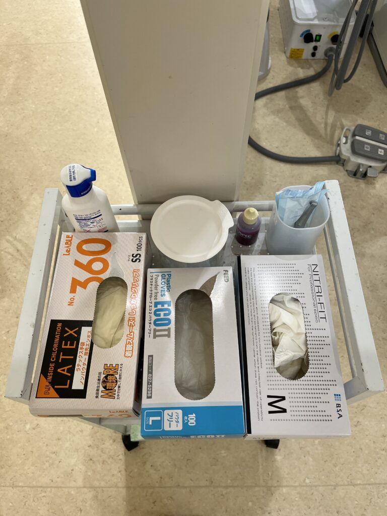 (歯医者で使う手袋)を置いており、使用するたびに新しいグローブに交換しています。
