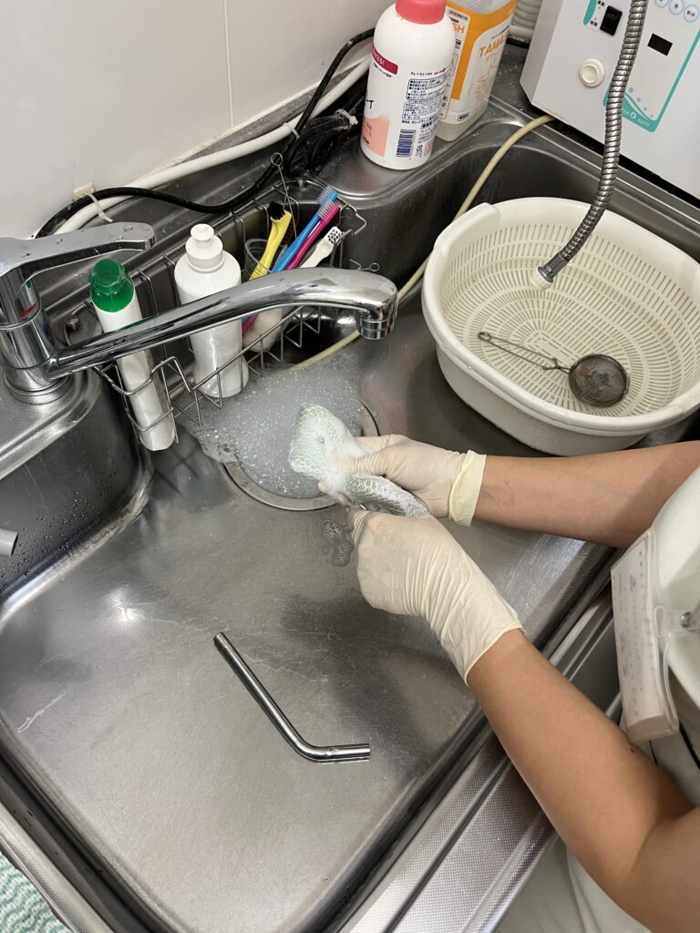 使用後の機材を洗う際もグローブを使用しております。